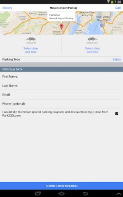 The app is a fast and simple way to book a parking spot at an off-Newark Airport parking facility. Make the reservation via your Android phone. Fill in your name, email address, departure date and time, as well as return date and time. Make sure to enter the time you will be arriving at and departing the facility — not the time of your flight! Submit your reservation and a screen will pop up saying your reservation was accepted. You can click to open a receipt, which you save on your Android phone and present at the parking lot. Additionally, the receipt will be emailed to you — meaning you can print it out and bring a hard copy to the facility. The app also connects you to Google Maps to provide turn-by-turn directions.