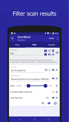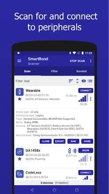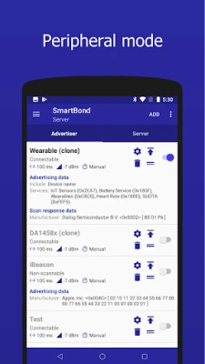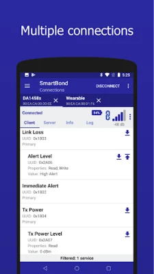 With the app you can scan for and connect to Bluetooth® Low Energy peripherals. Multiple connections and scan filtering are supported. You can also use the app in peripheral mode, so that other devices can scan for and connect to it.