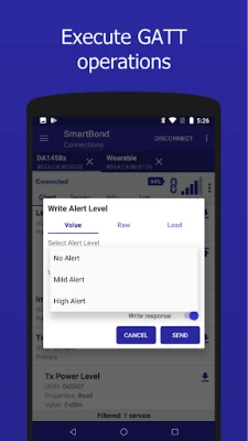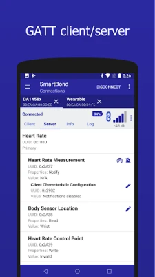 The app can act both as GATT client and GATT server. All GATT operations are supported. The app recognizes the Bluetooth® SIG adopted GATT objects, which are displayed with their proper names, their values are parsed and displayed as text, and, where supported, a custom write user interface is available. You can configure the GATT server and peripheral mode, either directly, or by cloning existing peripherals.